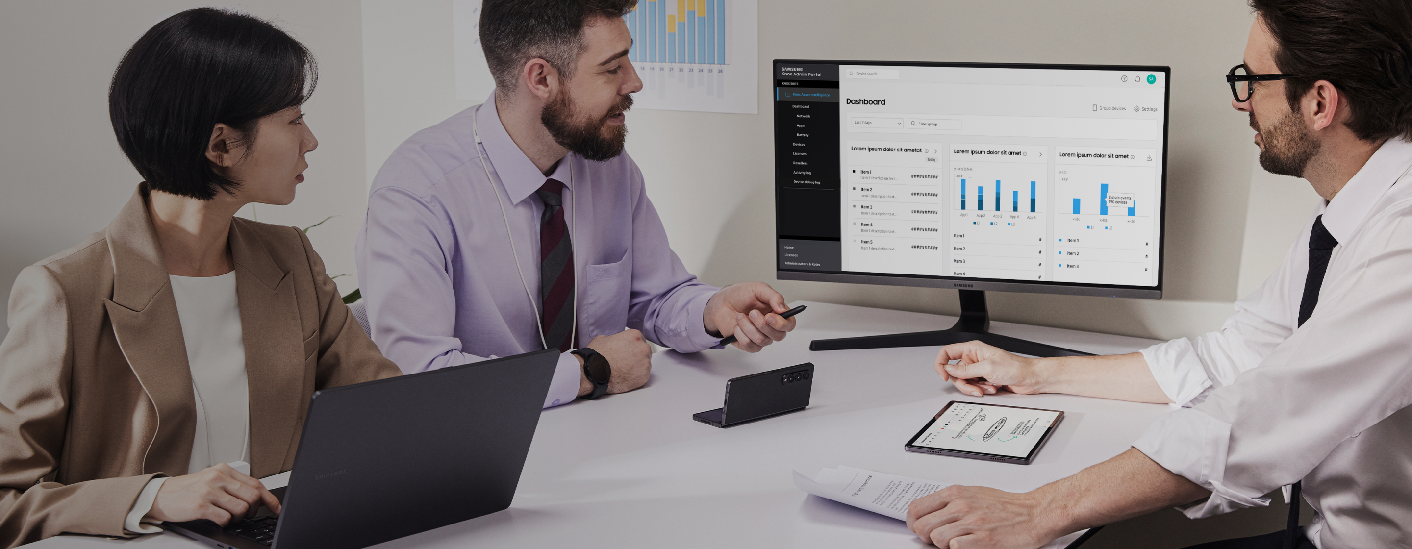 Mejore la administración, la productividad y el ciclo de vida de sus dispositivos comerciales con inteligencia basada en datos. Samsung entrega al equipo información procesable a partir de puntos de datos y análisis precisos y profundos, todo visible desde una consola en la nube
